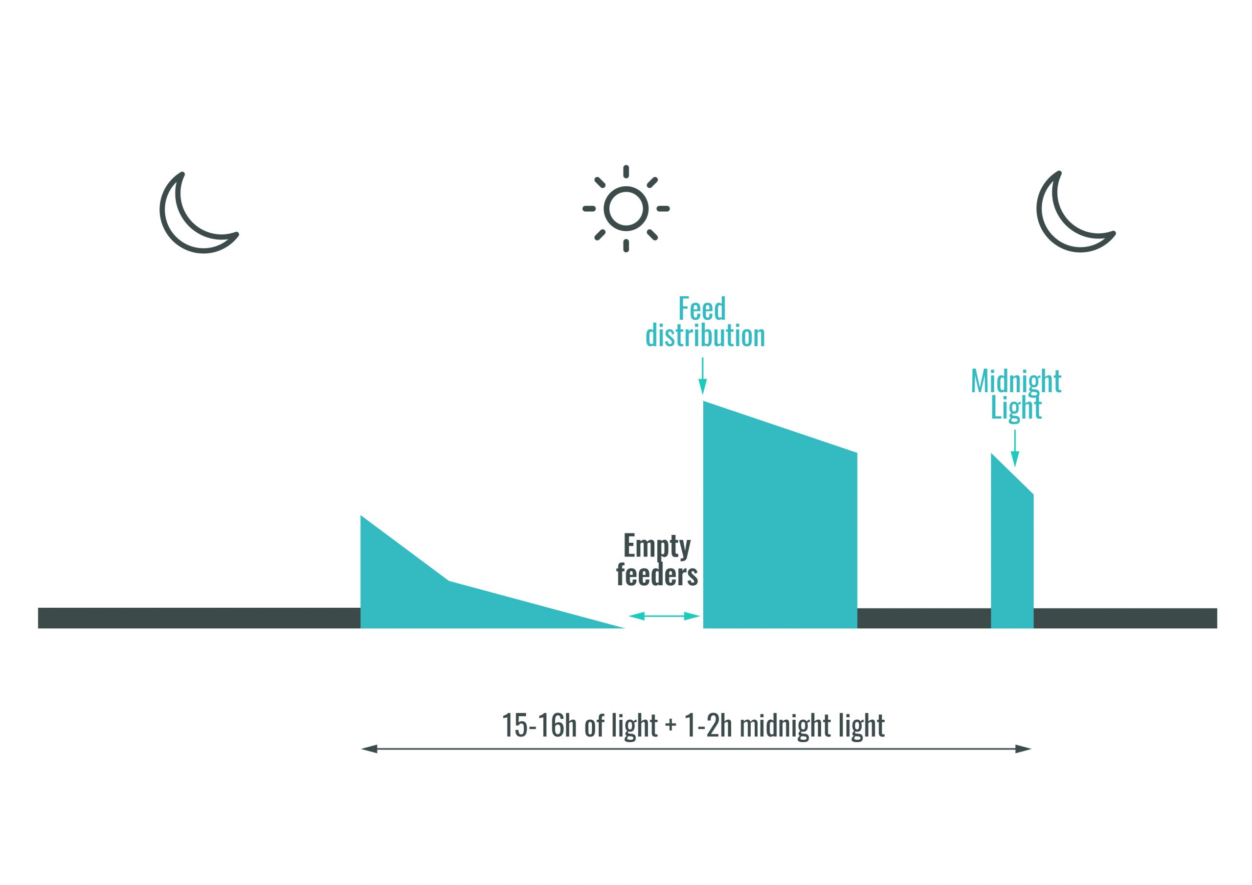 Una vez que las pollitas están listas porque han alcanzado el peso y uniformidad adecuado, es posible realizar la estimulación luminosa. No se debe estimular a las aves con un peso muy bajo porque esto reducirá el tamaño del huevo pero también afectará la calidad de cáscara al final del período de producción. La estimulación efectiva implica incrementar la duración del día por al menos 3 horas en un corto periodo de 3 semanas.