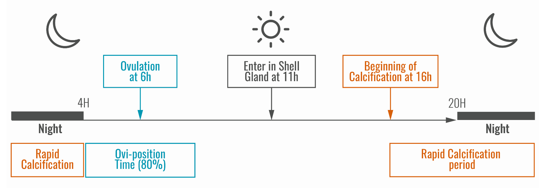 Una ponedora joven movilizará fácilmente el calcio a partir de su médula ósea para formar la cáscara cada día, principalmente en la noche. Sin embargo, esto debe apoyarse al proveer un buen carbonato. En general, la distribución entre carbonato grueso y fino es aproximadamente 60/40 en ponedoras marrón y 50/50 en ponedoras blancas con un consumo de 4 gramos/ave/día como mínimo. El alimento